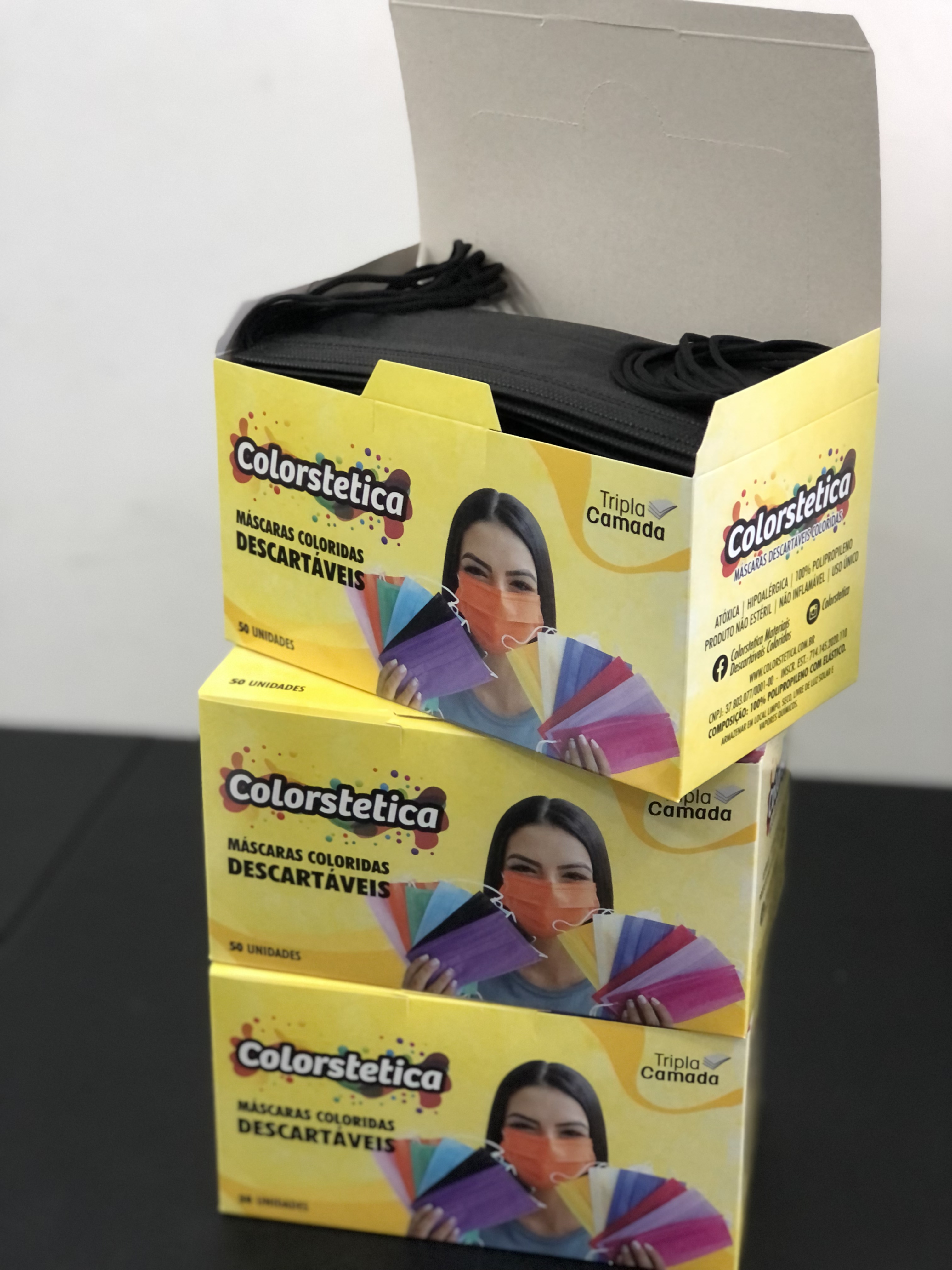 3 Caixas de máscaras triplas com elástico preto na cor preta . Marca colorstetica